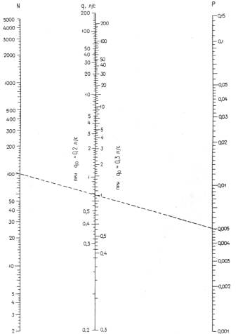 Черт. 2. Номограмма для определения секундных расходов воды q при q0 = 0,2 и 0,3