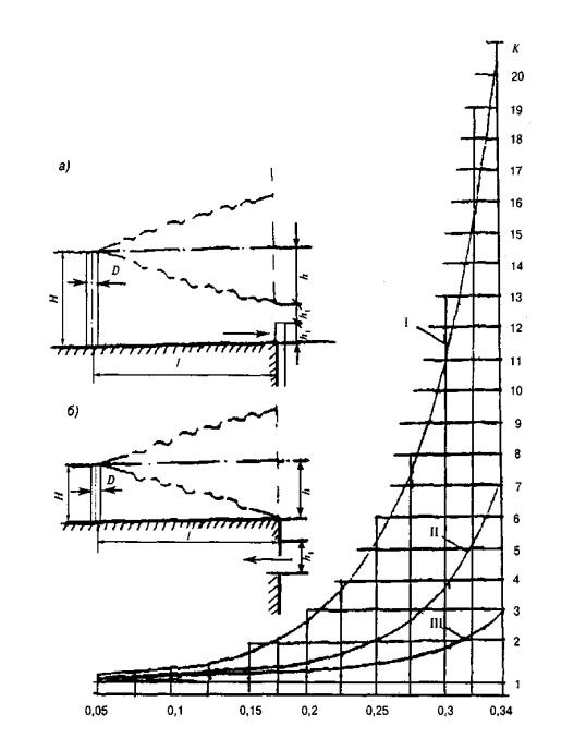 устройством (высота трубы источника Н= 2h1+h); б- то же,