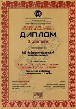 ОАО "Набережночелнинский крановый завод" получил под №1 сертификат соответствия продукции Техническому регламенту Таможенного союза "О безопасности машин и оборудования" на краны мостовые специальные грейферные грузоподъемностью до 32т.