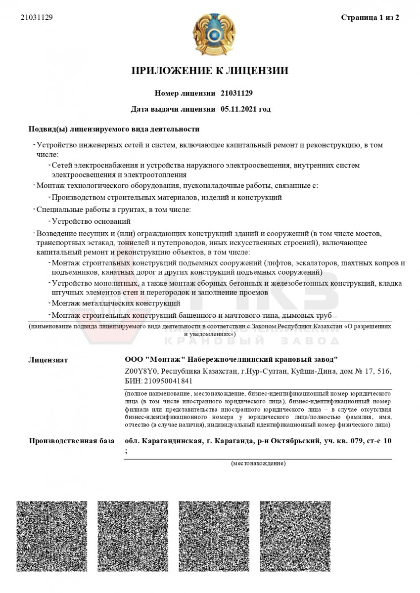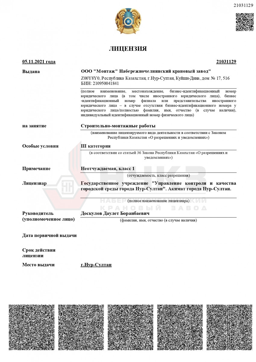 ООО «Монтаж» Набережночелнинский крановый завод» получило лицензию на проведение строительно-монтажных работ в Республике Казахстан, выданную Управлением контроля и качества городской среды города Нур-Султан.