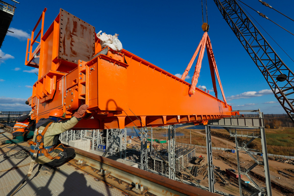 В середине октября завершена установка габаритных металлоконструкции крана. Для поднятия мостов и грузовой тележки на эстакаду был задействован тяжелый автокран Liebherr грузоподъёмностью 400 тонн.
