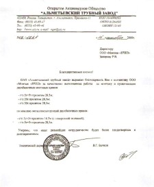 ОАО "Альметьевский трубный завод" выражает благодарность Вам и коллективу ООО "Монтаж "НЧКЗ" за качественно выполненные работы по монтажу и пуско-наладке двухбалочных мостовых кранов: