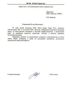 От лица нашей компании ООО "ФУЗО КамАЗ Тракс Рус" позвольте поблагодарить Вас и коллектив ООО "Монтаж "Набережночелнинский крановый завод" за ответственное отношение и высокий профессионализм в выполнении работ по разработке проектов, демонтажу, монтажу и ремонту крановых металлоконструкций.