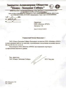ЗАО "Кварц- Западная Сибирь" благодарит коллектив ООО "Монтаж "НЧКЗ" за выполненные работы по монтажу, пусконаладке и испытанию козловых кранов КК-А4-СК-32-42-12/16-18.