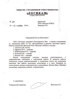 ООО "Логикам" выражает благодарность Вам и вашим сотрудникам за проведение работ по тех. обслуживанию и ремонту мостовых кранов. Работы производились бригадой ООО "Монтаж "НЧКЗ" в составе: