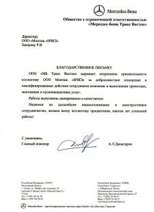 ООО "МБ Тракс Восток" выражает искреннюю признательность коллективу ООО Монтаж "НЧКЗ" за добросовестное отношение и квалифицированные действия сотрудников компании в выполнении проектных, монтажных и пусконаладочных услуг.