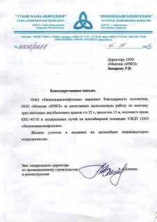 ОАО "Нижнекамскнефтехим" выражает благодарность коллективу ООО "Монтаж"НЧКЗ" за качественно выполненную работу по монтажу трех мостовых двухбалочных кранов г/п 32 т, пролетом 13 м, козлового крана ККС-45/10 и подкрановых путей на контейнерной площадке УЖДТ ОАО "Нижнекамскнефтехим".