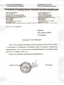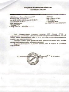 ОАО "УПТК" выражает благодарность Вам и коллективу ООО "Монтаж "НЧКЗ" за качественные и своевременно выполненные работы по разработке электрических принципиальных схем и полной замене электрооборудования на портальных кранах ККП-10 - 3 ед., TAKRAF г/п 20т - 3 ед.