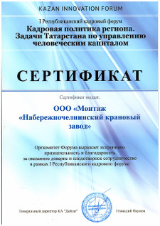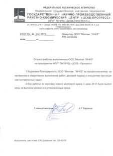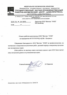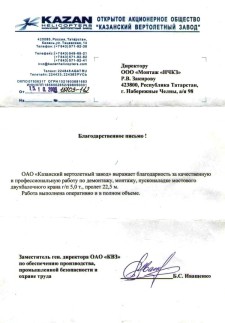 ОАО "Казанский вертолетный завод" выражает благодарность за качественную и профессиональную работу по демонтажу, монтажу и пусконаладке мостового двухбалочного крана г/п 5,0 т., пролет 22,5 м.