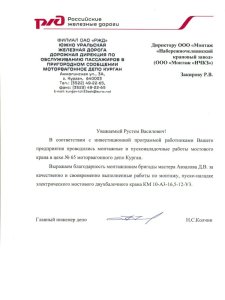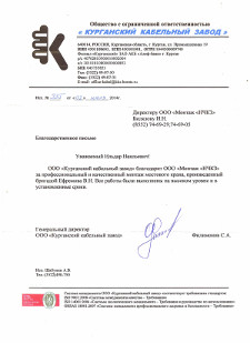 ООО "Курганский кабельный завод" благодарит ООО "Монтаж "НЧКЗ" за профессиональный и качественный монтаж мостового крана, произведенный бригадой Ефремова В.Н. Все работы были выполнены на высоком уровне и в установленные сроки