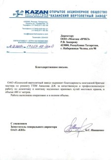 ОАО "Казанский вертолетный завод" выражает благодарность монтажной бригаде мастера по ремонту ГПМ Авзалова Д.В. за качественную и профессиональную работу по демонтажу и монтажу надземных крановых путей мостовых кранов, в объеме 480 п/метров.