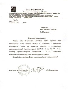 Филиал ОАО "Волгомост" Мостотряд №131 выражает свою благодарность ООО "Монтаж "НЧКЗ" за оперативную и качественно выполненную работу по демонтажу, монтажу и пуско-наладке металлоконструкций башенных кранов КБ-676-1 - 6 ед., КБ-674 - 3 ед., монтажу грузопассажирских подъемников - 2 ед., капитально-восстановительному ремонту мостового и козлового крана.