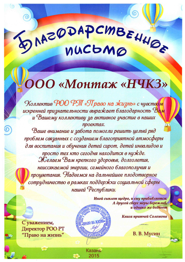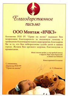 Коллектив РОО РТ "Право на жизнь" выражает Вам искреннюю благодарность за оказанную помощь в проведении благотворительного мероприятия. Благодарим Вас за то, что Вам небезразлична судьба детей в нашем городе. Желаем Вам крепкого здоровья, благополучия и процветания.