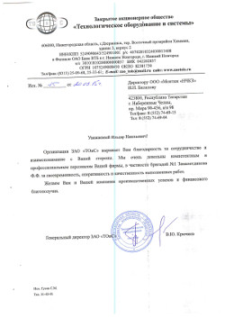 Организация ЗАО "ТОиС" выражает Вам благодарностьза сотрудничество и взаимопонимание с Вашей стороны. Мы очень довольны компетентным и профессиональным персоналом Вашей фирмы , в частности бригадой №1 Замалетдинова Ф.Ф. за своевременность, оперативность и качественность выполненных работ