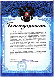 ОАО "РАФФ" выражает Вам благодарность за сотрудничество и взаимопонимание с Вашей стороны. Мы очень довольны компетентным и профессиональным персоналом Вашей фирмы, бригадой № 1 Замалетдинова Ф.Ф. в частности Кикбаевым С.Р., Гусейновым Р.И., Гайфутдиновым И.Г., Литвиновым А.В. за своевременность, оперативность, ответственность и качественность выполненных работ.