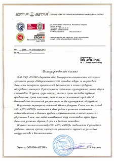 ООО ПКФ "БЕТАР" выражает свою благодарность специалистам «Экспертно-проектного центра "Набережночелнинского кранового завода" за оперативное выполнение экспертизы промышленной безопасности, а именно проведения обследования имеющихся в распоряжении организации грузоподъемных машин общим количеством 15 единиц, среди которых имеются краны мостовые подвесные однобалочные, краны консольные, тали, а также за оказанное содействие в восстановлении технической документации на все грузоподъемное оборудование.