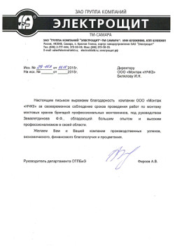 Настоящим письмом выражаем благодарность компании ООО "Монтаж "НЧКЗ" за своевременное соблюдение сроков проведения работ по монтажу мостовых кранов бригадой профессиональных монтажников, под руководством Замалетдинова Ф.Ф., обладающей большим опытом и высоким профессионализмом в своей области